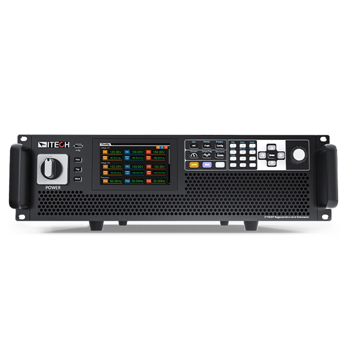 IT7900EP系列高性能回饋式電網(wǎng)模擬器提供用戶領(lǐng)先的一體化測(cè)試解決方案,全系列采用碳化硅(SiC)技術(shù),可以是一臺(tái)大功率交流電源,也可以作為電網(wǎng)模擬器使用,同時(shí)也是一臺(tái)回饋式的交/直流電子負(fù)載。全四象限運(yùn)行,高效的回饋能力可以將電能無(wú)污染的回饋電網(wǎng),滿足環(huán)保需求的同時(shí)也節(jié)省了大量用電和散熱成本。緊湊式、模塊化、高效率的結(jié)構(gòu)設(shè)計(jì),使IT7900EP可以在3U的體積內(nèi)提供21kVA的功率,主從并聯(lián)更可擴(kuò)展功率至1MVA以上。采用基于彩色觸摸屏的用戶界面,可以直接定義不同波形,豐富的操作模式滿足用戶單相,三相,反相的測(cè)試需求,為測(cè)試提供了較高的靈活性,可以廣泛應(yīng)用于光伏、儲(chǔ)能系統(tǒng)、新能源汽車等多個(gè)領(lǐng)域。