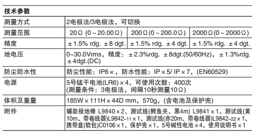 輔助接地棒L9840(2根/組)×1,測試線L9841(黑4m)×1,測試線L9842-11(黃10m,帶卷線器)×1,測試線L9842-22(紅20m,帶卷線器)×1,攜帶包C0106×1,保護(hù)殼×1,5號堿性電池(LR6)×4,使用說明書×1