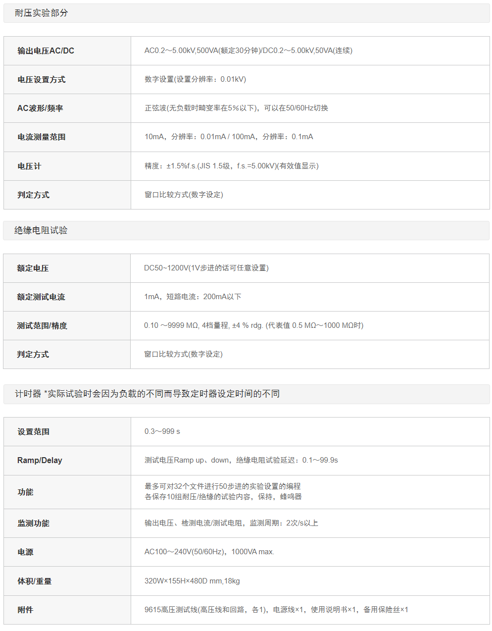 AC/DC耐壓和絕緣試驗一體化的機型,實現(xiàn)最大500VA的變壓器電容 耐壓:AC 5kV, 100mA 耐壓:DC 5kV, 10mA 絕緣電阻:DC 50V ? 1200V , ?9999MΩ 基本精度±4%rdg.