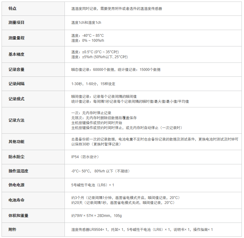 濕度傳感器LR9504× 1,托架× 1,5號堿性干電池(LR6)× 1,說明書× 1,操作指南× 1
