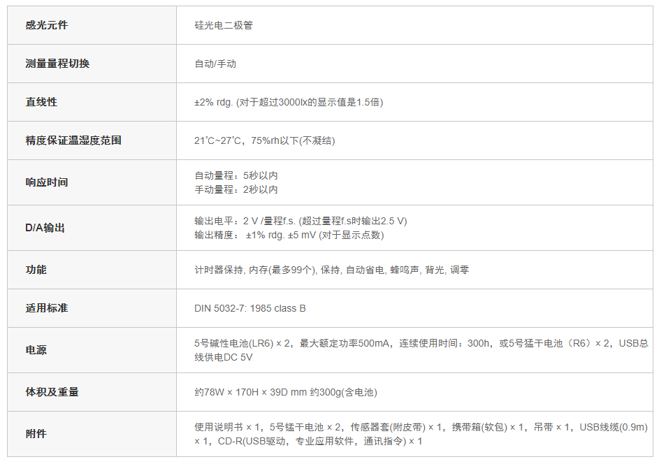 JIS C 1609-1:符合2006一般型Class AA 覆蓋范圍廣,從LED照明和低照度(應(yīng)急燈等)到高照度的測(cè)量