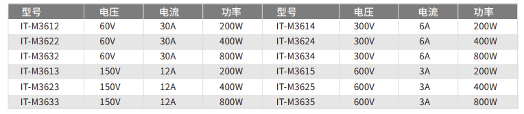 IT-M3600擁有1/2U的Mini體積,可提供800W功率輸出,不但具備高功率密度,同時也擁有高分辨率、高精度和高穩(wěn)定性等特性。輸出電壓可達600V,輸出電流可達30A。全系列共有12個型號,寬范圍輸出設計,一臺機器可涵蓋廣范圍的應用需求。