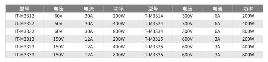 IT-M3300 回饋式直流電子負載既能模擬各種負載特性,又能將電能無污染的回饋電網(wǎng)。采用高功率密度設計,1/2U的體積內(nèi)可提供高達800W的功率吸收,靈活的模組式架構,可以滿足客戶的不同電流功率的測試需求。同時具備高精度的輸出和量測,并且針對測試做了多項安全設計,適合用于各種類型電池放電、多通道電源、半導體老化等多個測試領域。