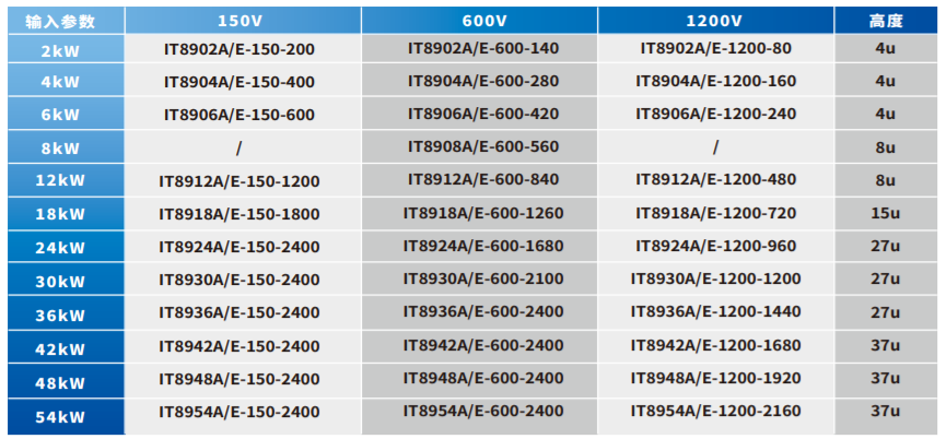 IT8900A/E系列高功率密度大功率直流電子負(fù)載,具有150V、600V、1200V三種電壓范圍,單機(jī)功率從2kW到 54kW。較寬的電壓電流范圍,單機(jī)柜電流可達(dá)2400A。通過主從并聯(lián),功率可擴(kuò)展到600kW。高功率密度,6kW僅4u高度。多達(dá)8種工作模式,具有較快的環(huán)路響應(yīng)和電流上升、下降速度,另有動態(tài)模式、OCP、OPP測試、自動測試及電池測試功能。內(nèi)置CAN、LAN、GPIB、USB、RS232和模擬量接口等,并具有多種保護(hù)功能,可應(yīng)用于動力電池的放電、直流充電樁、車載充電機(jī)(obc)、燃料電池堆、功率電子及其他電力電子產(chǎn)品的測試使用。